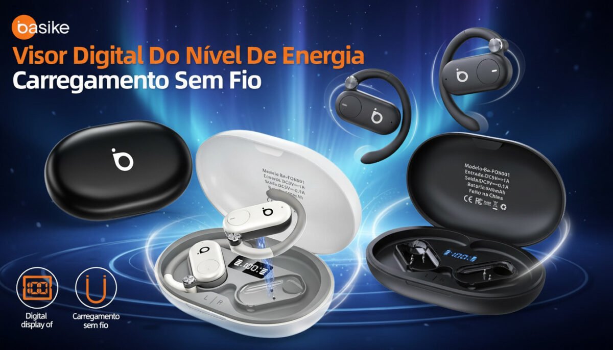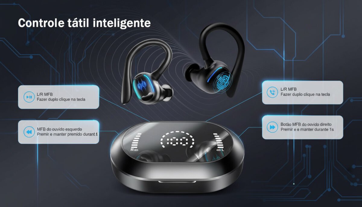 O grande diferencial é a autonomia de 50 horas totais (8 horas nos fones + 42 horas no estojo de carregamento) – você trabalha a semana inteira e ainda faz seus treinos sem precisar recarregar. O display LED mostra o nível de bateria em tempo real, evitando surpresas no meio de reuniões importantes.